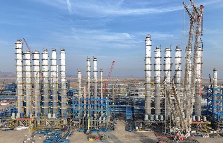 精馏装置为项目A标段吊装难度最大的装置,共有塔类设备23台,总重9395.38吨。其中,最大单体粗馏一级塔总重678吨,内径5.8米,高101米。项目大件设备吊装选用3200吨吊车主吊、750吨履带吊溜尾,从首件设备起吊到全部就位仅用时90天,提前实现工程节点目标,再次在国际市场展示了雄厚的吊装技术实力,创造了中国化学三化建“阿曼速度”,进一步擦亮了企业品牌底色。